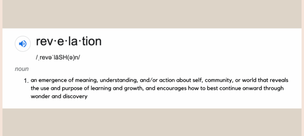 Revelatory Mindset is a present mindset. It holds time, intention and attention in the moment. Revelatory Mindset is interested and engaged with new information, conversations, experiences and the physical world. Revelatory Mindset holds the present and reflects on previous learning and experiences. The capacity of a Revelatory Mindset expands beyond urgency and fear, and trusts the process of growth through habits of relationship building, reflection, connection and openness.