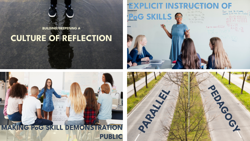 - Parallel Pedagogy: Centering the PoG applies to everyone in your system. We are all learners of the PoG. The implementation of a PoG can often falter when the adult learning is not attended to alongside the student learning. The PoG skills should not just be for the students. Which means that the adults in the system will need their own type of supported learning, opportunities to practice and receive feedback, reflection time, public demonstrations of growth, etc. The PoG allows everyone to travel in the same direction.