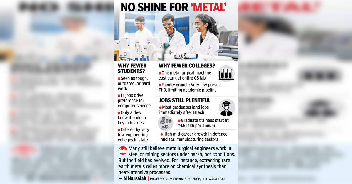 Due to the shortfall in specialised graduates, industries often recruit from allied branches like mechanical or electrical engineering. “The demand for material science and metallurgical engineers is quite high, but it’s being met by students from other disciplines,” said K Ramanjaneyulu, head of the department at MGIT. The problem, educators said, is also rooted in perception. Computer science continues to dominate student preferences, pushing other fields to the margins.