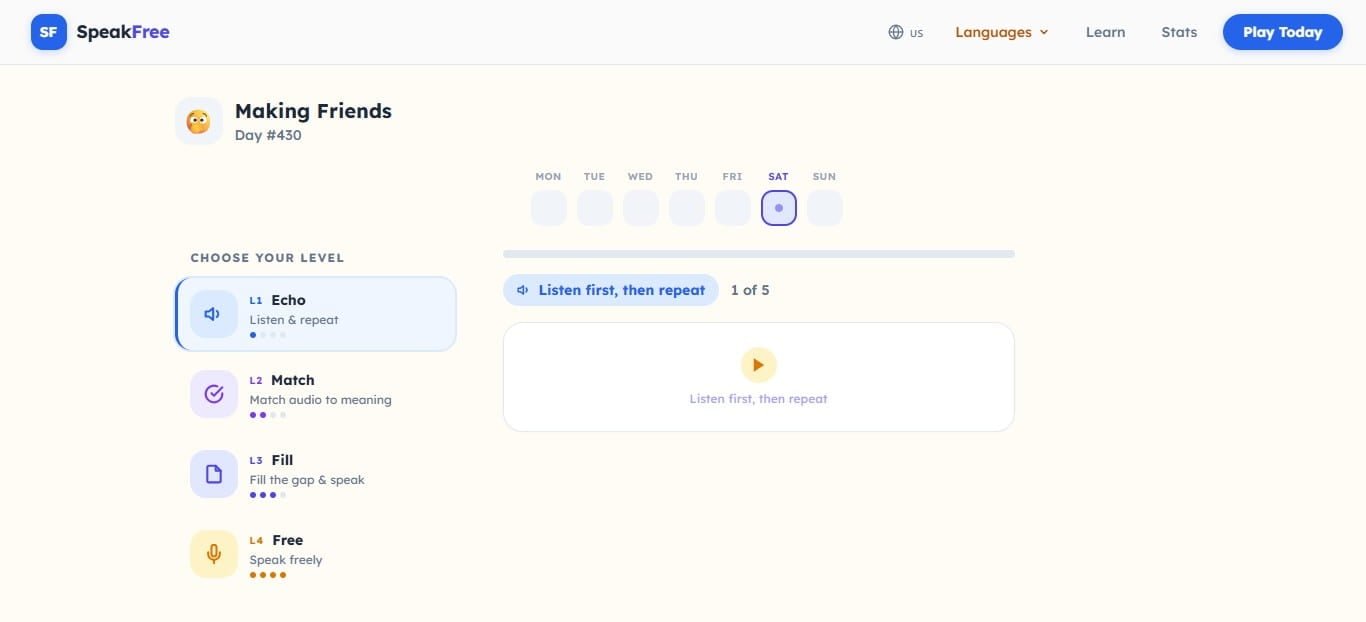 Speak Free offers several new English speaking exercises each day, primarily, though not exclusively, focused on AI evaluation of pronunciation.